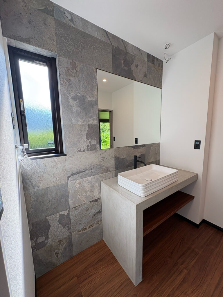 モルタル調仕上げのキッチンやタイル壁を用いた洗面スペースなど写真映えも意識したデザインとしました。